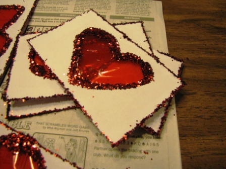| Valentine's that I'm working on. They will be secret decoders. You write in light blue, then color over it in red, orange, and pink. The secret decoder makes it possible to read your adorable message under all that coloring. This site has a better explanation and pictures. |